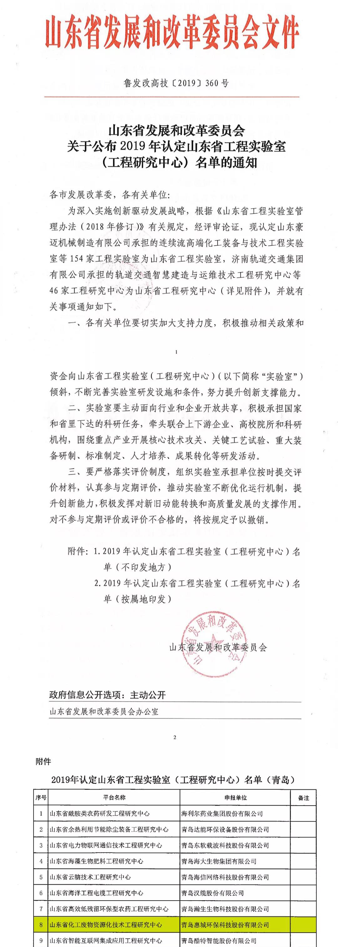 日前,根據(jù)山東省發(fā)展和改革委《關于公布2019年認定山東省工程實驗室(工程研究中心)名單的通知》(魯發(fā)改高技〔2019〕360號)發(fā)布文件,我公司申報的省級工程研究中心獲批并被認定為山東省化工廢物資源化技術工程研究中心。