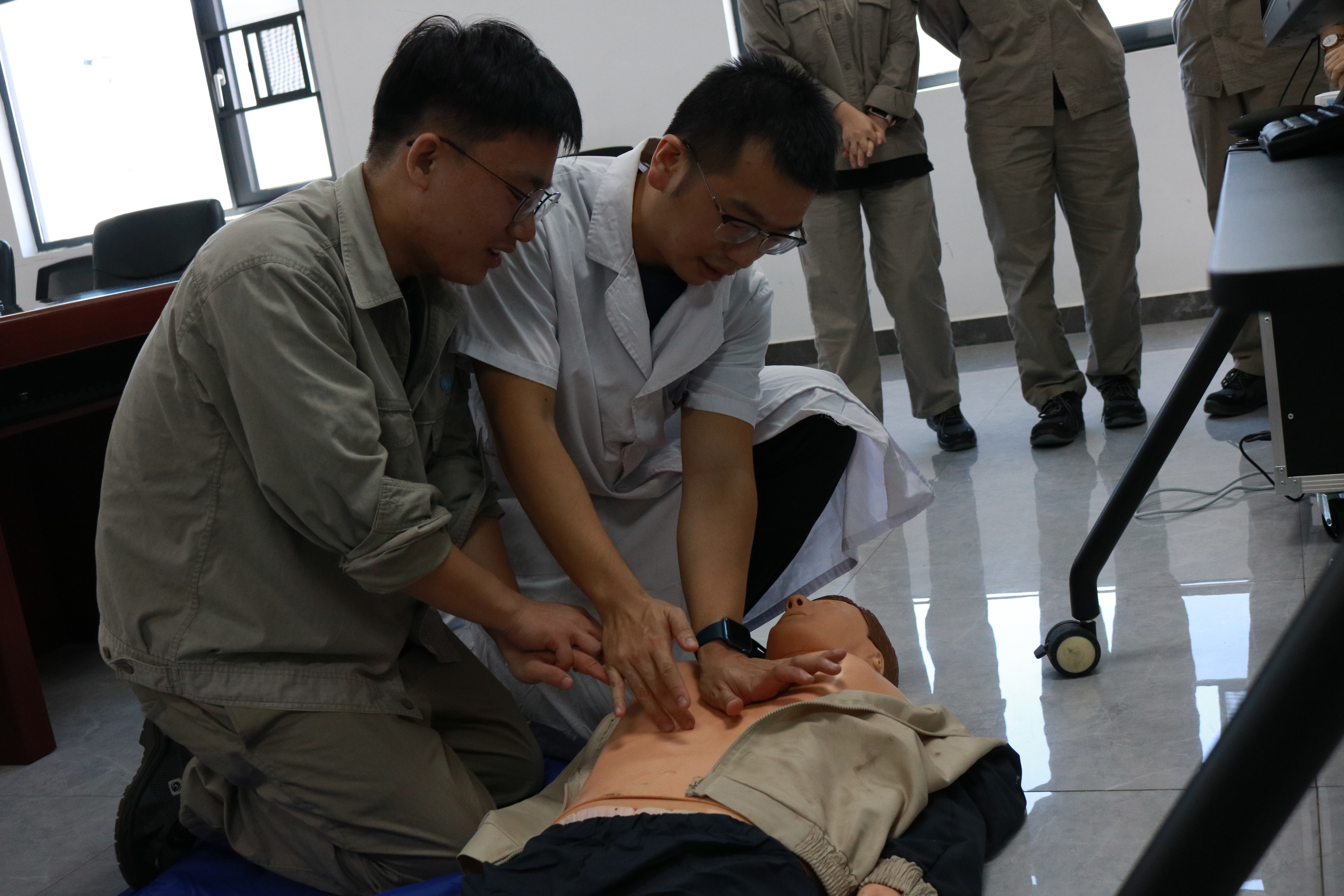 理論講解結束后,進入模擬操作和現(xiàn)場指導環(huán)節(jié)。陳宏主任用模擬人演示了完整的CPR流程,隨后,員工們進行實操練習,陳宏主任悉心指導每位員工的操作,對不規(guī)范的動作進行耐心的示范和糾正,員工及時規(guī)范急救動作,反復操作,直到掌握正確方法。