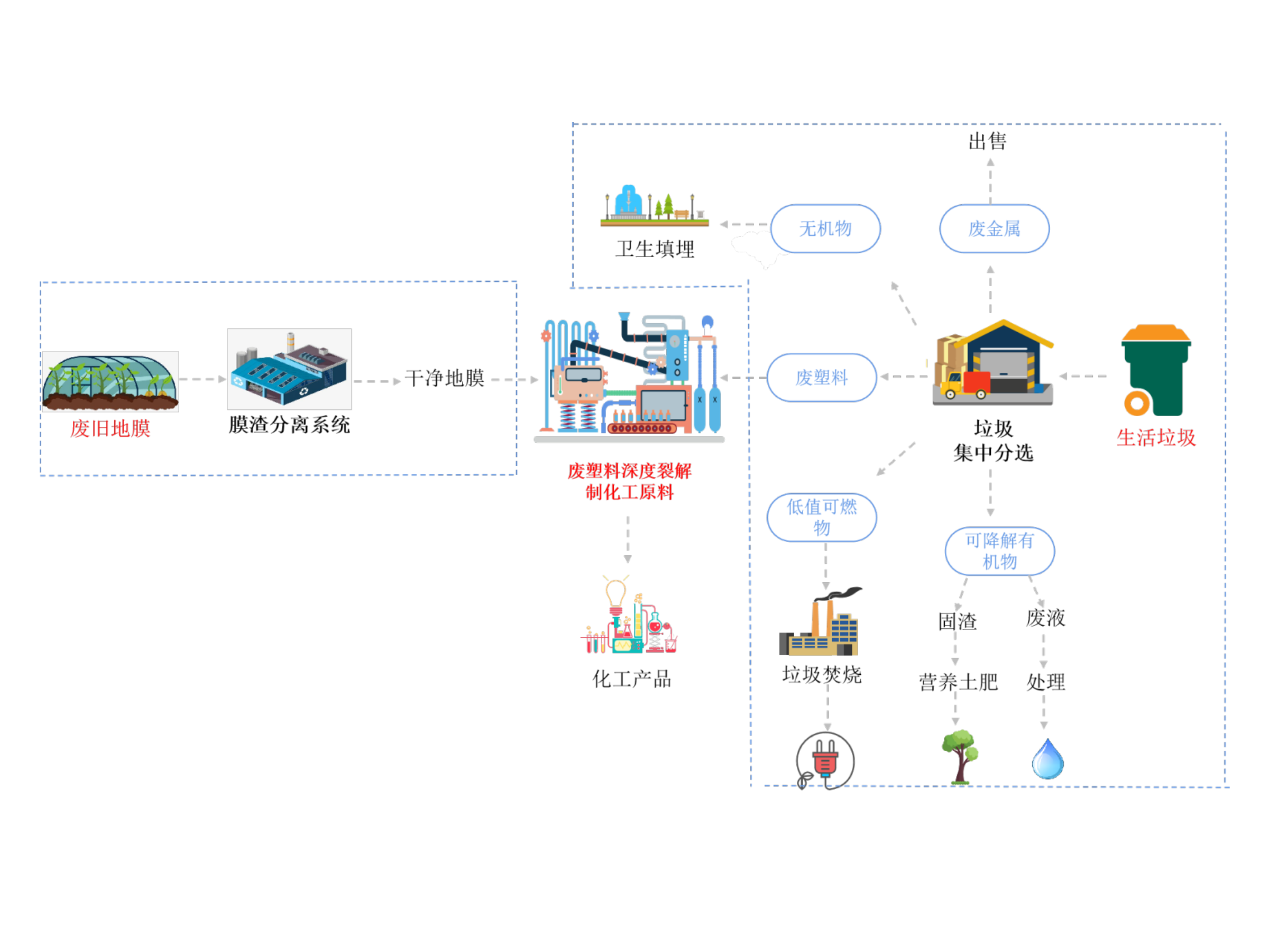 垃圾集中機械化自動分選技術由惠城環(huán)保技術團隊自主研發(fā),更注重的是垃圾中端的處理,因為末端的處理方式只能是填埋焚燒。通過精細化集約式的高效分選體系,將生產、生活中的廢塑料全量回收再利用,可將金屬、無機物、有機液和低值混合可燃物進行一次性分離,分選獲得的物料,部分可直接作為產品進行出售,其他高值化垃圾可經過其他手段重新加工為合格的再循環(huán)利用產品;再對低值的塑料進行二次精分,經過惠城環(huán)保自主研發(fā)的另一項創(chuàng)新技術——混合廢塑料深度催化裂解(CPDCC)技術可轉化為高清潔化工原料,構成了廢塑料全閉環(huán)的產業(yè)鏈條。